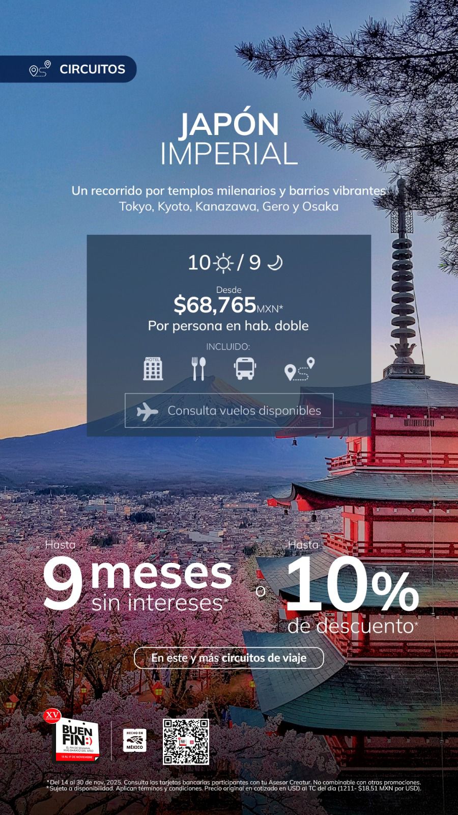 Japón Imperial 10 Días 9 Noches Descripción Descripción Descripcioón general: Un recorrido por templosmilenarios y barrios vibrantes, Tokyo, Kyoto, Kanazawa, Gero y Osaka. Date & Time Package Type Back Continue Puede enviar su consulta a través del siguiente formulario. Nombre del viaje: * Japón Imperial Your name: * Your email: * Country * Elige un país*AfghanistanÅland IslandsAlbaniaAlgeriaAmerican SamoaAndorraAngolaAnguillaAntarcticaAntigua and BarbudaArgentinaArmeniaArubaAustraliaAustriaAzerbaijanBahamasBahrainBangladeshBarbadosBelarusBelgiumBelauBelizeBeninBermudaBhutanBoliviaBonaire, Saint Eustatius and SabaBosnia and HerzegovinaBotswanaBouvet IslandBrazilBritish Indian Ocean TerritoryBruneiBulgariaBurkina FasoBurundiCambodiaCameroonCanadaCape VerdeCayman IslandsCentral African RepublicChadChileChinaChristmas IslandCocos (Keeling) IslandsColombiaComorosCongo (Brazzaville)Congo (Kinshasa)Cook IslandsCosta RicaCroatiaCubaCuraçaoCyprusCzech RepublicDenmarkDjiboutiDominicaDominican RepublicEcuadorEgyptEl SalvadorEquatorial GuineaEritreaEstoniaEthiopiaFalkland IslandsFaroe IslandsFijiFinlandFranceFrench GuianaFrench PolynesiaFrench Southern TerritoriesGabonGambiaGeorgiaGermanyGhanaGibraltarGreeceGreenlandGrenadaGuadeloupeGuamGuatemalaGuernseyGuineaGuinea-BissauGuyanaHaitiHeard Island and McDonald IslandsHondurasHong KongHungaryIcelandIndiaIndonesiaIranIraqIrelandIsle of ManIsraelItalyIvory CoastJamaicaJapanJerseyJordanKazakhstanKenyaKiribatiKuwaitKyrgyzstanLaosLatviaLebanonLesothoLiberiaLibyaLiechtensteinLithuaniaLuxembourgMacaoNorth MacedoniaMadagascarMalawiMalaysiaMaldivesMaliMaltaMarshall IslandsMartiniqueMauritaniaMauritiusMayotteMexicoMicronesiaMoldovaMonacoMongoliaMontenegroMontserratMoroccoMozambiqueMyanmarNamibiaNauruNepalNetherlandsNew CaledoniaNew ZealandNicaraguaNigerNigeriaNiueNorfolk IslandNorthern Mariana IslandsNorth KoreaNorwayOmanPakistanPalestinian TerritoryPanamaPapua New GuineaParaguayPeruPhilippinesPitcairnPolandPortugalPuerto RicoQatarReunionRomaniaRussiaRwandaSaint BarthélemySaint HelenaSaint Kitts and NevisSaint LuciaSaint Martin (French part)Saint Martin (Dutch part)Saint Pierre and MiquelonSaint Vincent and the GrenadinesSan MarinoSão Tomé and PríncipeSaudi ArabiaSenegalSerbiaSeychellesSierra LeoneSingaporeSlovakiaSloveniaSolomon IslandsSomaliaSouth AfricaSouth Georgia/Sandwich IslandsSouth KoreaSouth SudanSpainSri LankaSudanSurinameSvalbard and Jan MayenSwazilandSwedenSwitzerlandSyriaTaiwanTajikistanTanzaniaThailandTimor-LesteTogoTokelauTongaTrinidad and TobagoTunisiaTurkeyTurkmenistanTurks and Caicos IslandsTuvaluUgandaUkraineUnited Arab EmiratesUnited Kingdom (UK)United States (US)United States (US) Minor Outlying IslandsUruguayUzbekistanVanuatuVaticanVenezuelaVietnamVirgin Islands (British)Virgin Islands (US)Wallis and FutunaWestern SaharaSamoaYemenZambiaZimbabwe Contact number: * No. of Adults * No. of children Enquiry Subject: * Your Message * Al contactar con nosotros, usted acepta nuestro Aviso de privacidad. Incluido: Transporte Transporte Comidas Alimentos Alojamiento Alojamiento Circuitos Circuitos Destinos Japón Featured Trips